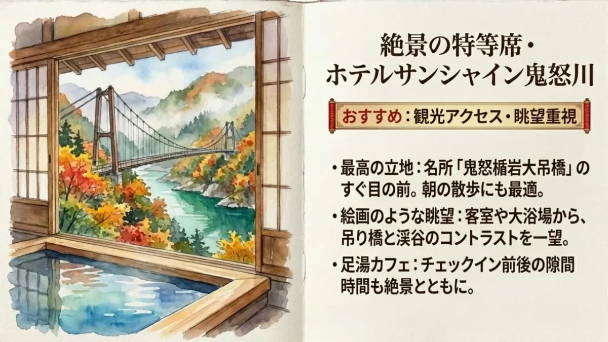 ♨︎ 名所「鬼怒楯岩大吊橋」を眼前に望む