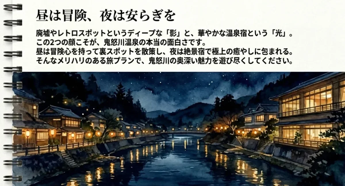 昼間は冒険心を持って裏スポットを散策し、夜は絶景宿で極上の癒やしに包まれる。