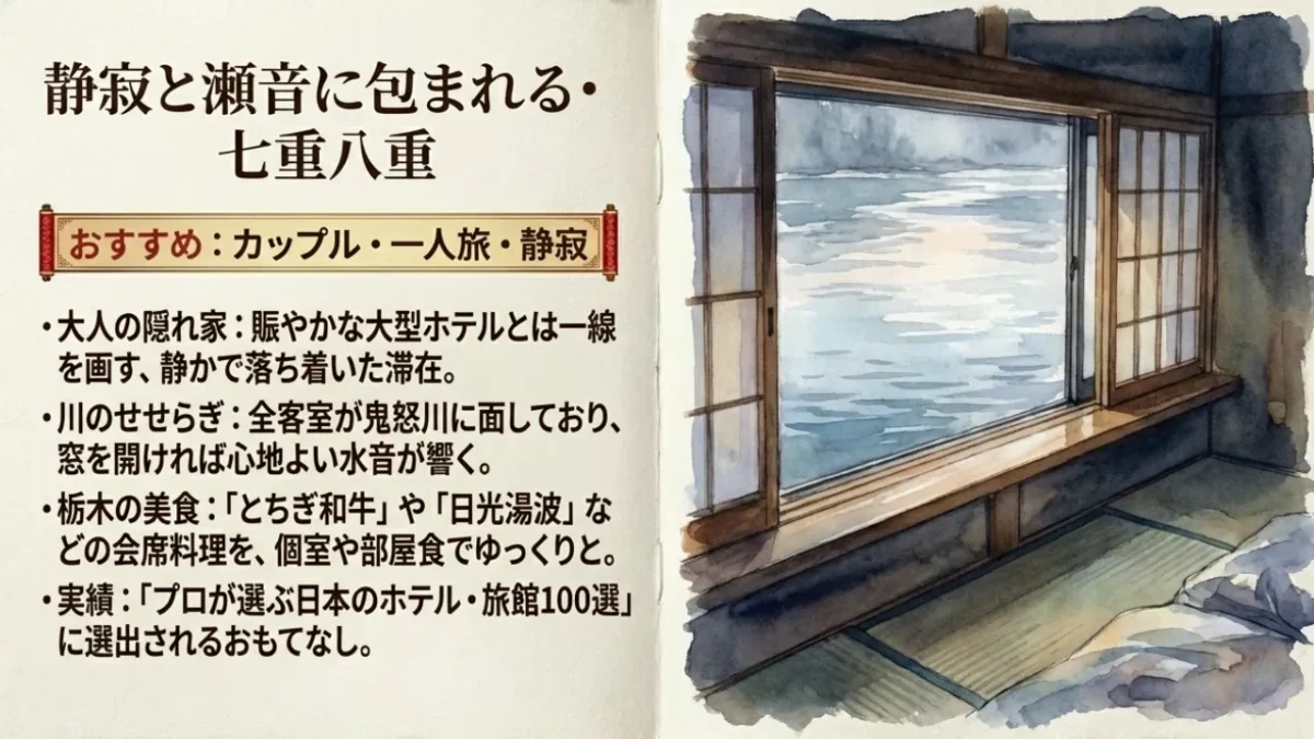 賑やかな大型ホテルとは一線を画す、静かで落ち着いた滞在を求めるなら「七重八重」がおすすめです。