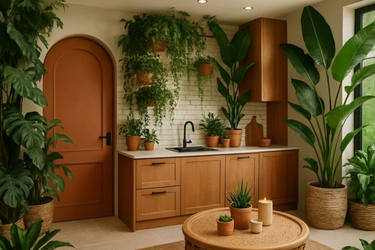 キッチンは、ジャングルインテリアには意外な場所かもしれませんが、アースカラーと自然素材を組み合わせることで、温かく個性的な空間に変身します。